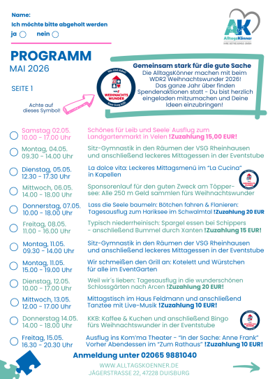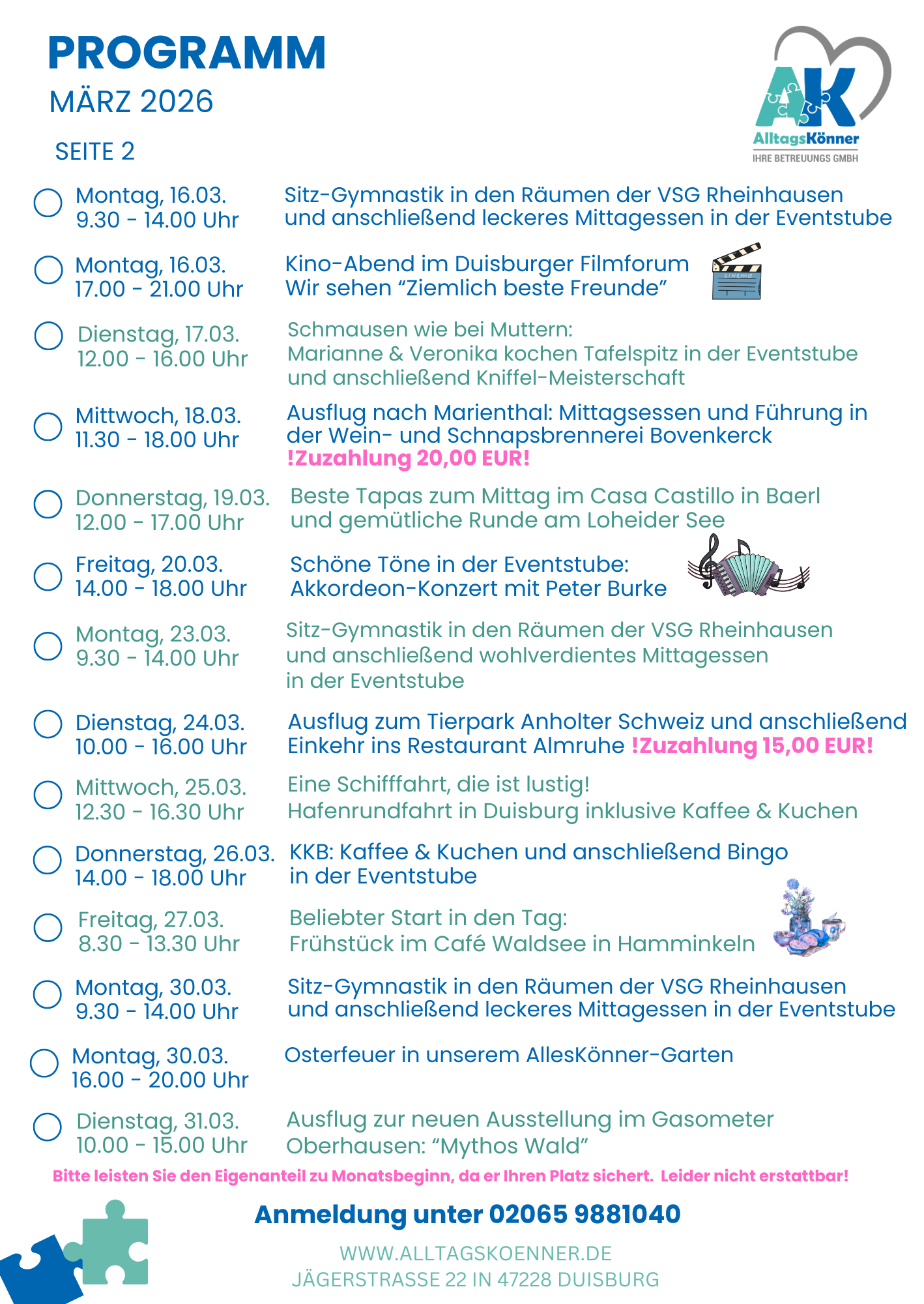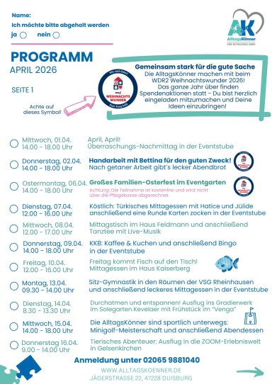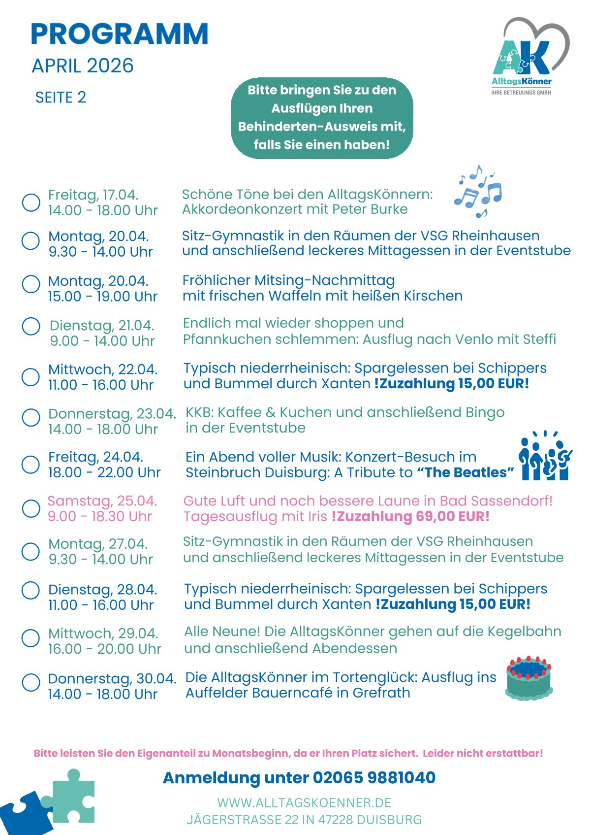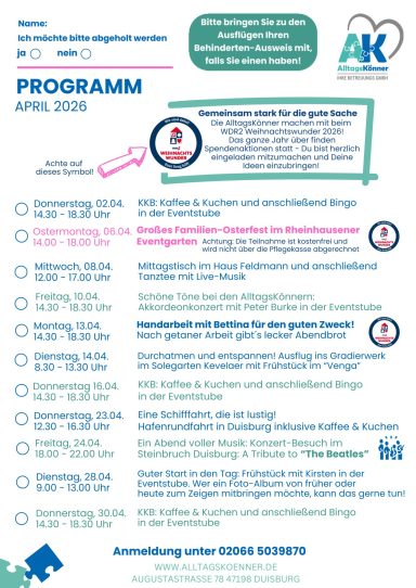 Personen ohne Pflegegrad können gerne ebenfalls teilnehmen. Bitte lassen Sie uns die Abrechnung im Vorfeld individuell besprechen.