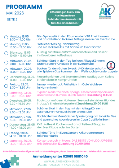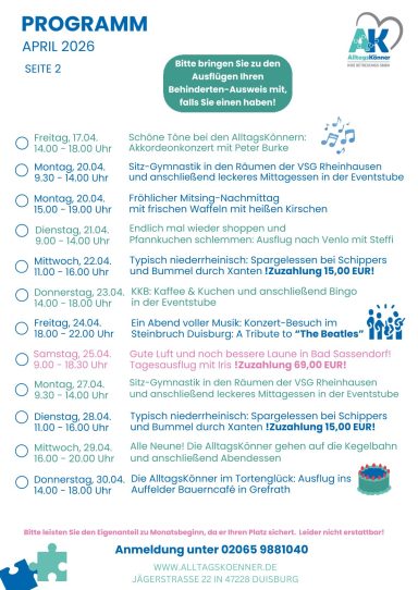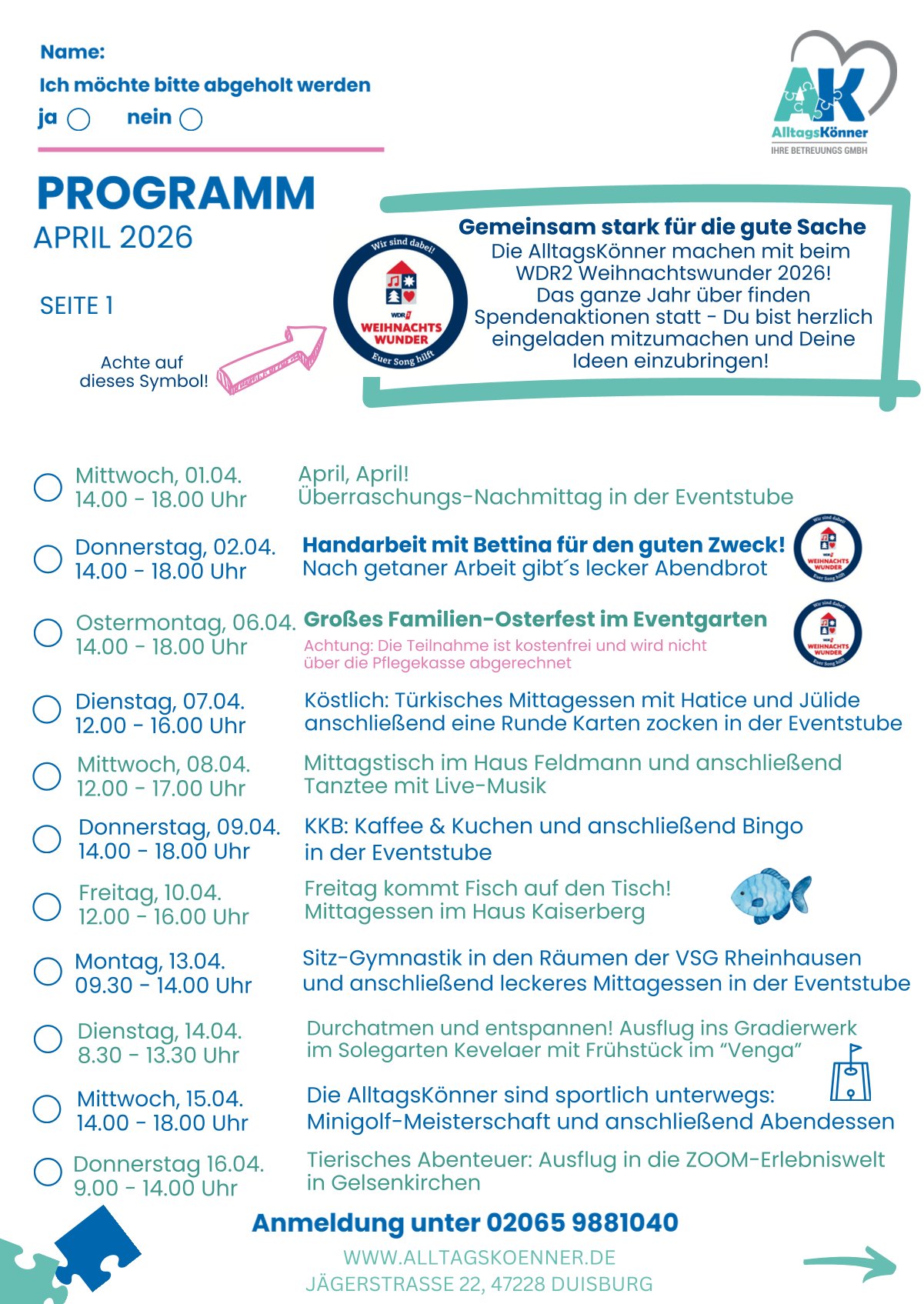 Wird der Kunde vom Alltagshelfer zu Hause abgeholt und zu unseren Räumlichkeiten und zurück gebracht, ist dies inklusive!